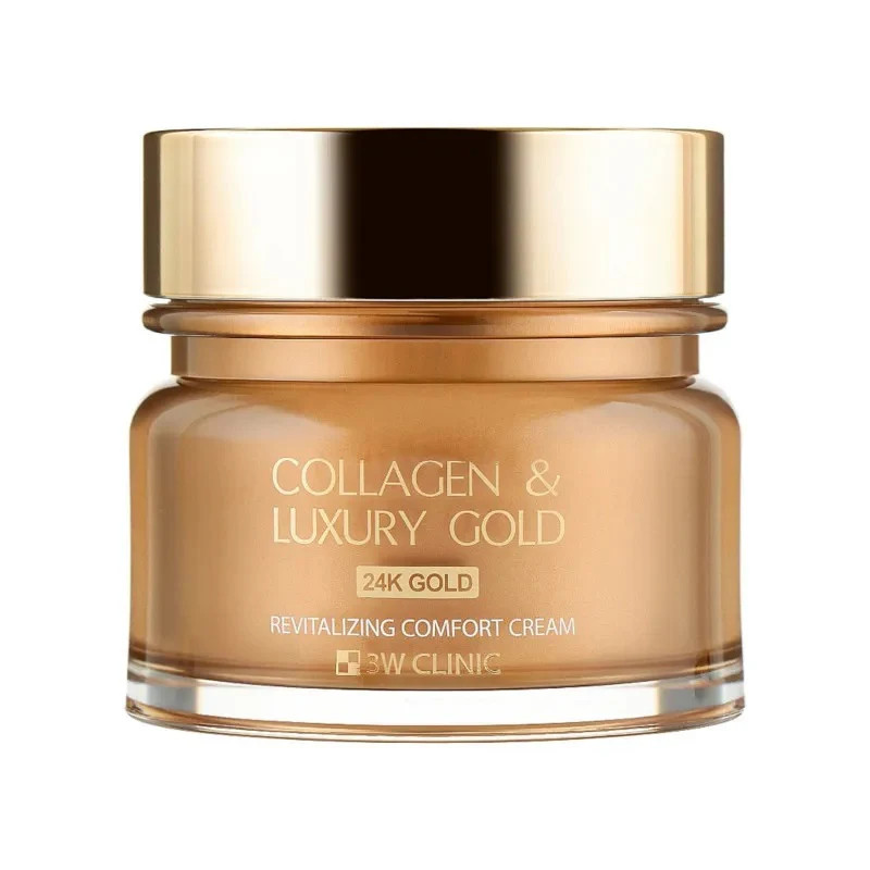 3W Clinic Collagen & Luxury Gold Cream 100ml is a premium anti-aging moisturizer formulated with pure 24K gold and vegetable collagen to deeply hydrate, firm, and brighten the skin for a more youthful appearance.