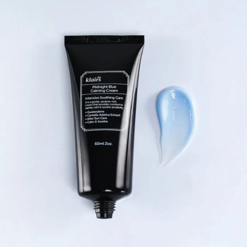 Dear, Klairs Midnight Blue Calming Cream 60ml is an intensive soothing and hydrating cream designed to rapidly calm irritated, sensitive, or acne-prone skin and reduce redness. The 60ml version provides an increased volume in a convenient tube packaging, ideal for both home use and travel.