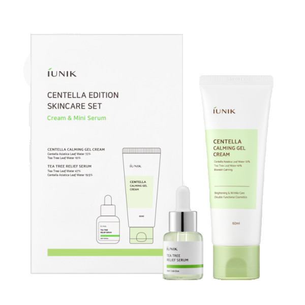 iUNIK Centella Edition Skincare Set is a duo of products designed to soothe, hydrate, and calm sensitive, acne-prone, and irritated skin using high concentrations of Centella Asiatica and Tea Tree extracts. The set typically includes a full-size gel cream and a smaller serum, making it a convenient option for daily use and travel.