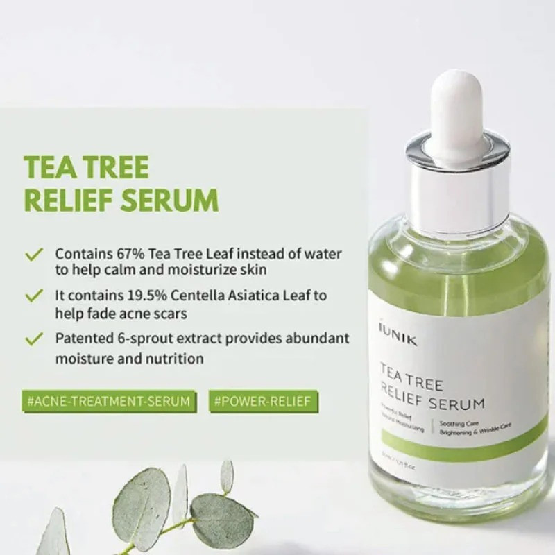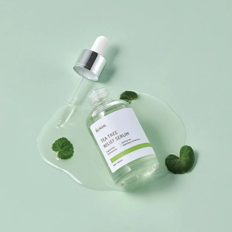 iUNIK Tea Tree Relief Serum is a lightweight, non-greasy K-beauty serum specifically designed to soothe, calm, and treat sensitive and acne-prone skin, while also brightening and providing anti-aging benefits.