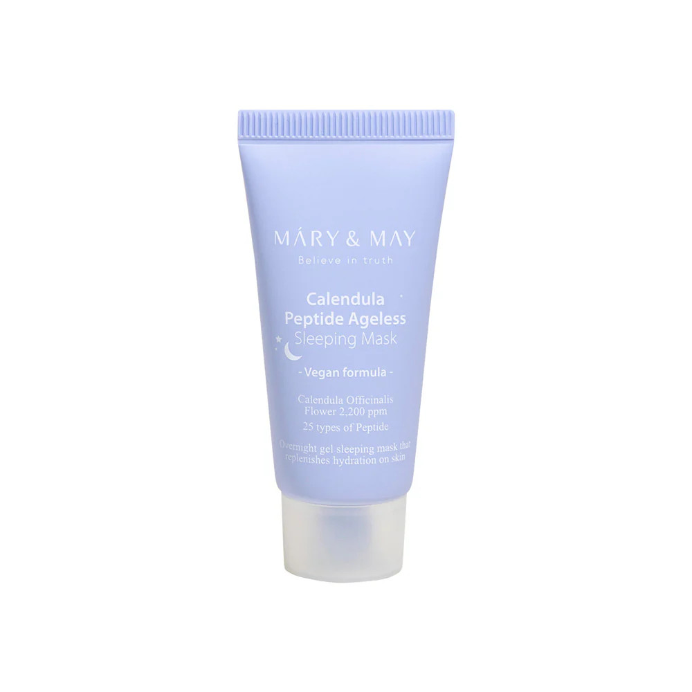Mary & May Calendula Peptide Ageless Sleeping Mask is a gel-type sleeping mask that contains Calendula Extract and 25 types of Peptides to provide a powerful boost to your skin’s health and appearance. Calendula is a plant extract that has anti-inflammatory and antioxidant properties. When combined with peptides, it can help to reduce the appearance of fine lines and wrinkles, improve skin texture, and promote a more youthful, radiant complexion.Enriched with Guaiazulene from Chamomile, Centella Asiatica extract, Panthenol, and Hyaluronic Acid to soothe, moisturize, and reduce redness. The watery gel texture spreads smoothly on skin and adheres to the skin while the active ingredients work overnight for you to wake up with plump and radiant skin.