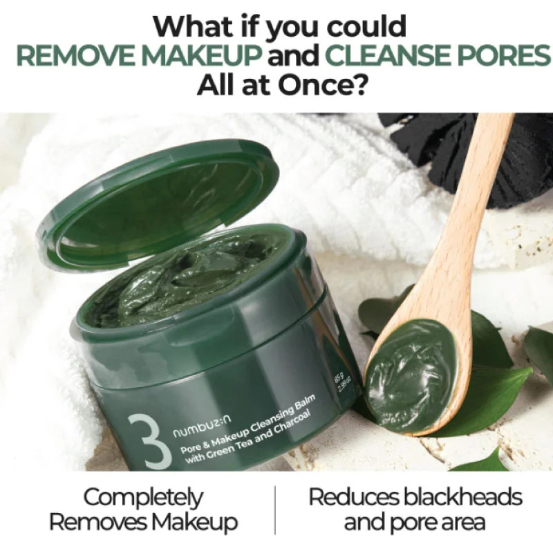 Numbuzin No.3 Pore & Makeup Cleansing Balm with added Green Tea, and Charcoal removes heavy makeup while clearing the skin texture.