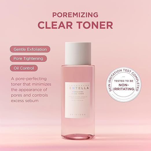 SKIN1004 Madagascar Centella Poremizing Clear Toner 210ml is an exfoliating toner that helps to decrease the visibility of enlarged pores, while helping to gently renew the skin’s texture. The formula boasts a complex of 4 types of exfoliating acids. These acids work to remove dead skin cells, also helping to unclog pores. The result is a skin surface that is not only smoother and softer but also purified. Moreover, Himalayan pink salt boasts a high mineral content, with over 80 different minerals. The salinity creates an osmotic pressure that aids in drawing out impurities from the pores, ensuring a thorough cleanse. The Sebum Cleaner helps to control excess sebum, ensuring that the skin remains balanced. Last but not least, the inclusion of Madagascar Centella asiatica extract ensures that the skin remains soothed and protected during the exfoliation process. In essence, this toner helps to unclog and reduce the visibility of pores, while delivering a smooth and refined skin texture.