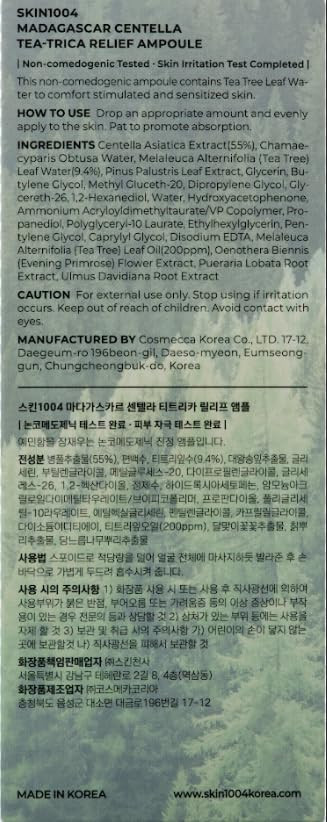 Centella Asiatica Extract(55%), Chamaecyparis Obtusa Water, Melaleuca Alternifolia (Tea Tree) Leaf Water(9.4%), Pinus Palustris Leaf Extract, Glycerine, Butylene Glycol, Methyl Gluceth-20, Dipropylene Glycol, Glycereth-26, 1,2-Hexanediol, Water, Hydroxyacetophenone, Ammonium Acryloyldimethyltaurate/VP Copolymer, Propanediol, Polyglyceryl-10 Laurate, Ethylhexylglycerin, Pentylene Glycol, Caprylyl Glycol, Disodium EDTA Melaleuca Alternifolia Leaf Oil (200PPM), Oenothera Biennis (Evening Primrose) Flower Extract, Pueraria Lobata Root Extrac, Ulmus Davidiana Root Extract