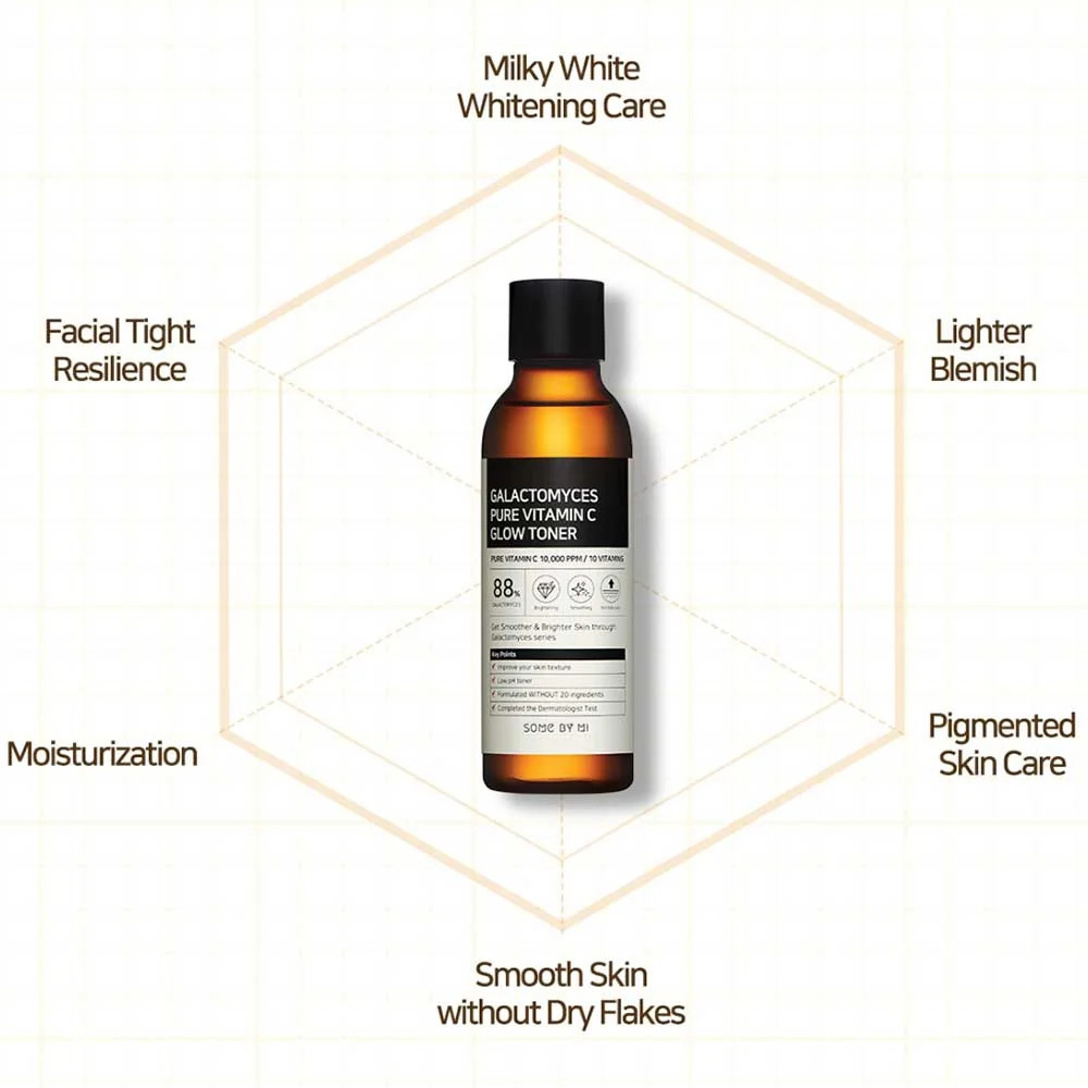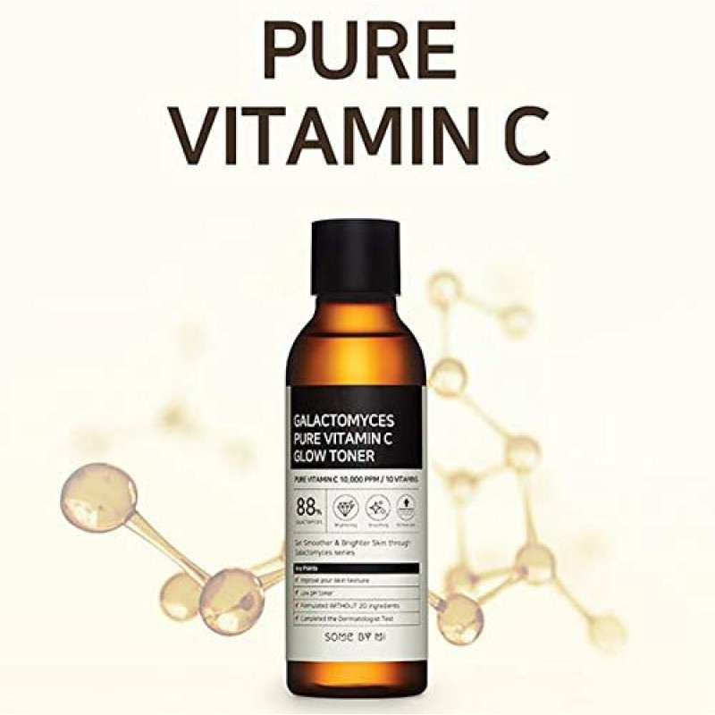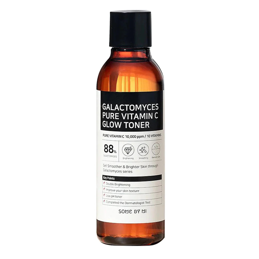 Some By Mi Galactomyces Pure Vitamin C Glow Toner 200ml is a brightening and hydrating toner that combines 88% galactomyces ferment filtrate with 10,000 ppm of pure vitamin C to improve skin tone, texture, and elasticity.