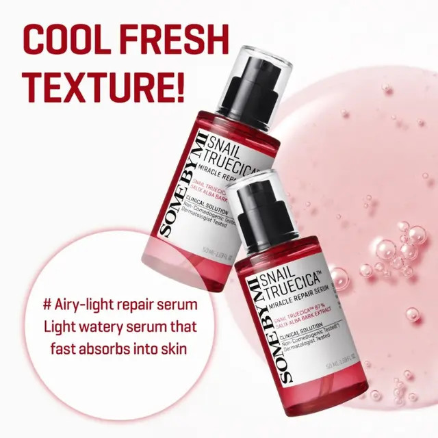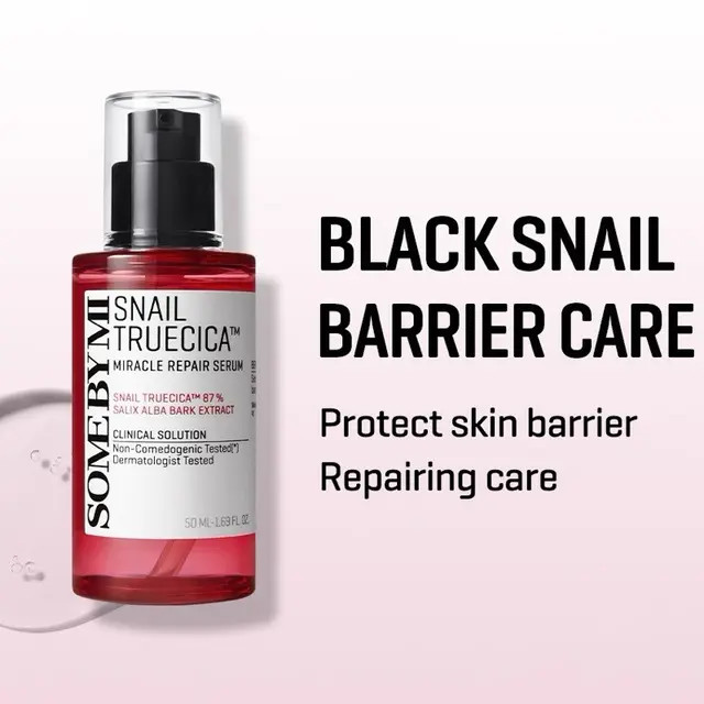 SOME BY MI Snail Truecica Miracle Repair Serum 50ml is a skin-repairing serum designed for damaged, scarred, and sensitive skin, utilizing a blend of black snail mucin and soothing ingredients to regenerate skin and strengthen its barrier. It has a lightweight, non-sticky texture and is a dual-functional product with both brightening and anti-wrinkle effects.