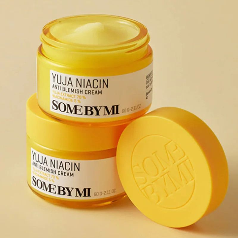 SOME BY MI Yuja Niacin Anti Blemish Cream - 60ml is a multi-functional cream designed to reduce the appearance of blemishes, freckles, and dark spots while brightening and hydrating the skin for a smoother complexion. It can be used as both a regular day cream and a thicker overnight sleeping mask.