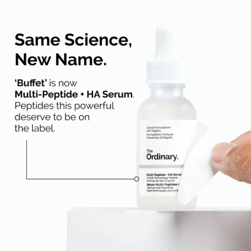 The Ordinary Multi-Peptide + HA Serum, formerly known as "Buffet", is a water-based, anti-aging serum that combines multiple peptide technologies and hyaluronic acid to target various signs of aging, such as fine lines, wrinkles, and loss of elasticity.