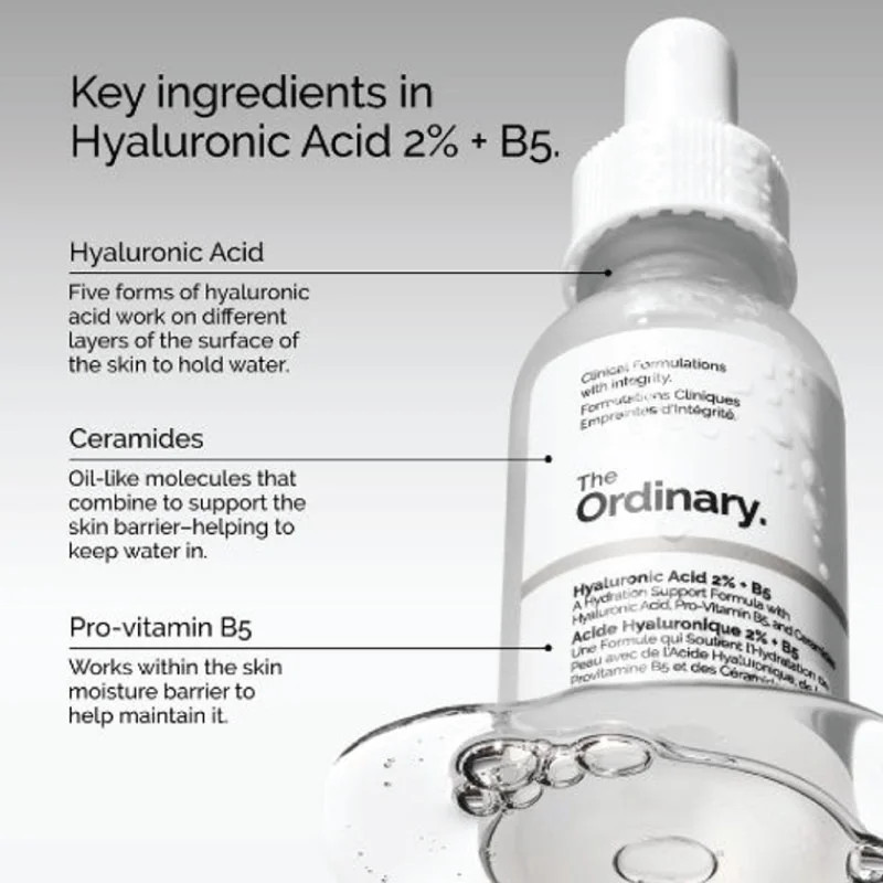 The Ordinary Hyaluronic Acid 2% + B5 is a water-based serum that provides multi-depth hydration for plump, smooth, and healthy-looking skin. It combines low, medium, and high molecular weight hyaluronic acid (HA) with a vitamin B5 to hydrate the skin from the surface down to deeper layers.