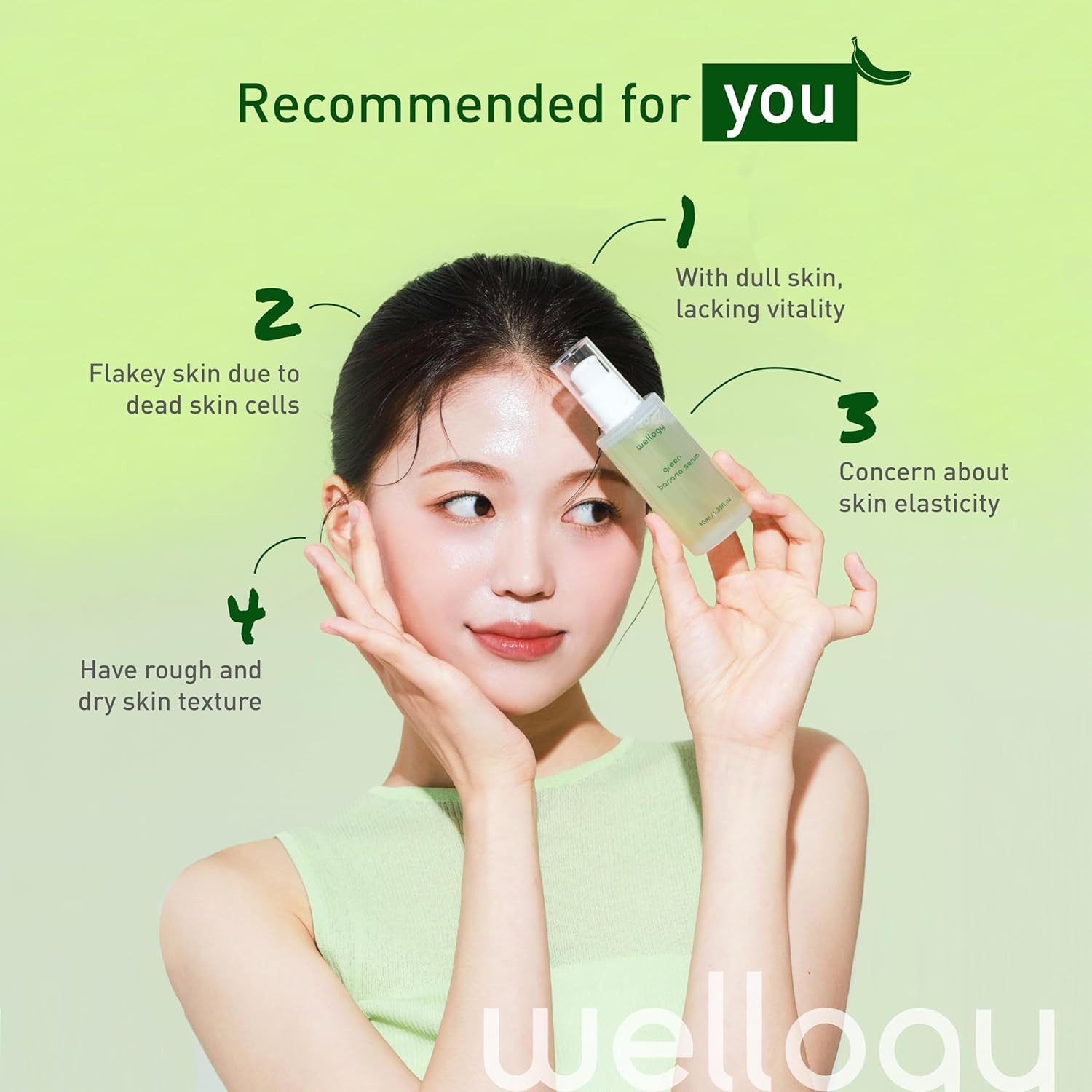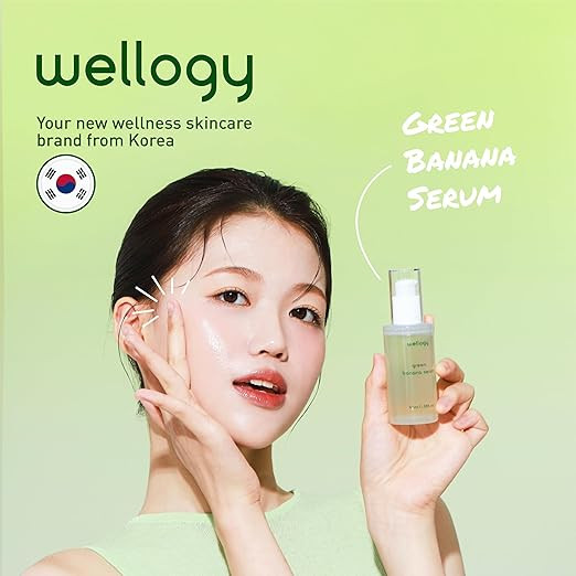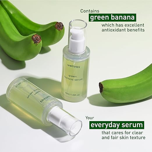 Wellogy Green Banana Serum is a daily, lightweight facial serum enriched with antioxidants and vitamins from green banana extract, Niacinamide, and Vitamin C. It is designed to brighten the complexion, correct dark spots, smooth skin texture, and provide deep hydration for all skin types, including sensitive skin.